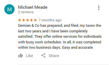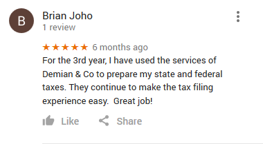 If you’re looking to get your taxes prepared in East Brunswick or Cranford, NJ, Demian & Company, LLC have it covered. We have served many customers and provided them with reliable tax preparation services each and every time. But you don’t have to just take our word for it. Here we’ll highlight some of our customer reviews from this most recent tax season. Some of them are return customers, and all of them were happy with the work we’ve done for them.